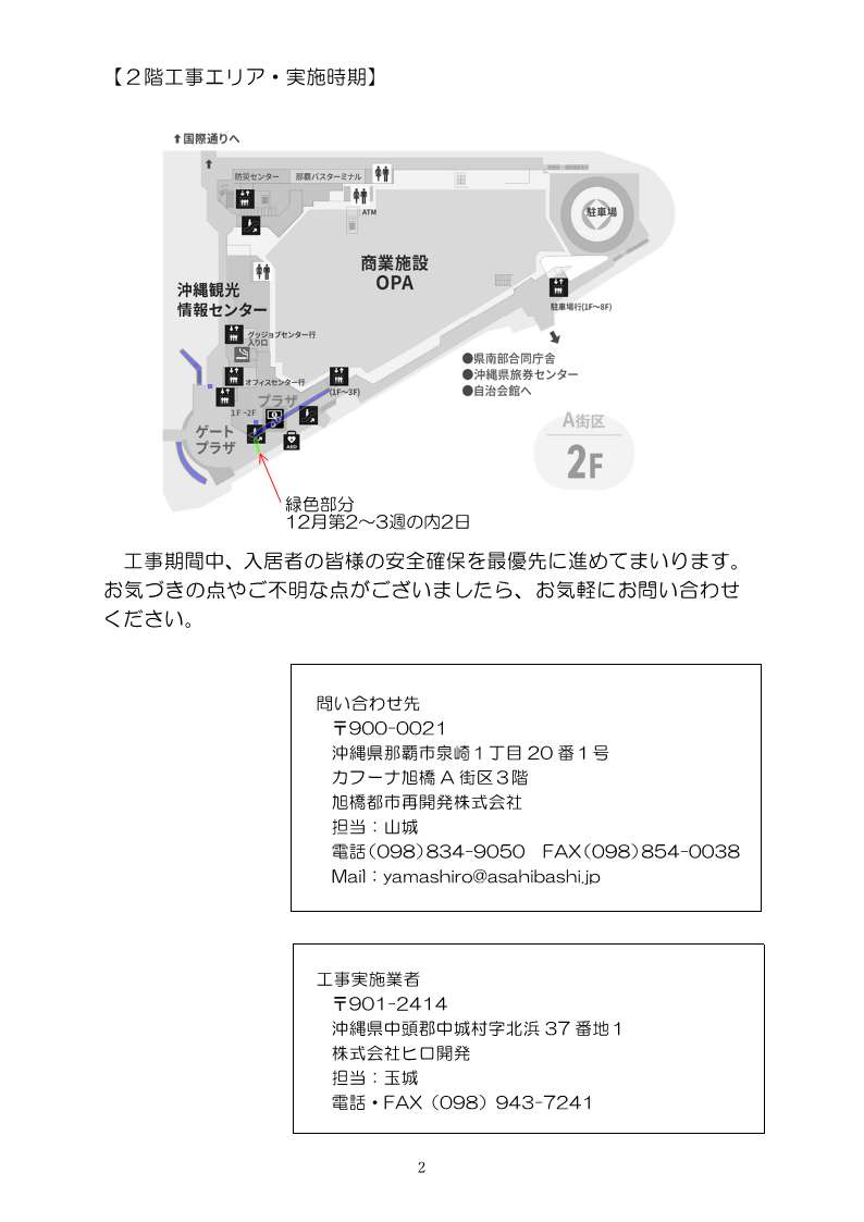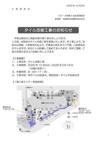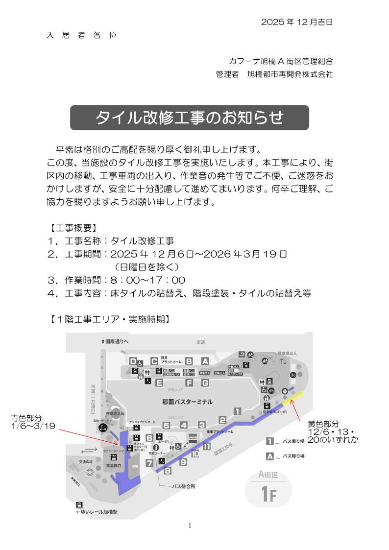 平素は格別のご高配を賜り厚く御礼申し上げます。カフーナ旭橋A街区にて、タイル改修工事を実施しております。